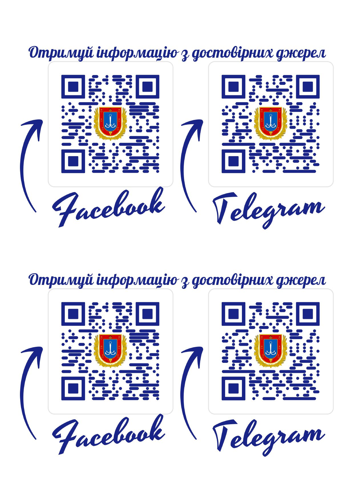 Отримуй інформацію з достовірних джерел QR-коди з переходом на Фейсбук та Телеграм ОВА